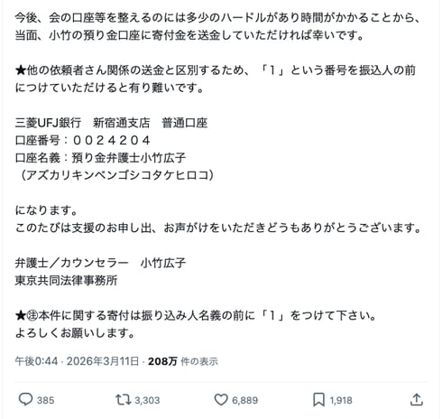 また、同じ加害者による他の被害者や、他の教員による若年性被害者への支援についても検討していく。準備が整うまで、寄付の募集には小竹弁護士の預り金口座を使用する。