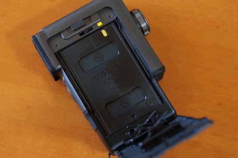 片手でさくっと動画を撮るカメラにしてはグリップ部が太いのであるが、それは中にinstax miniフィルムが装填されているから。
