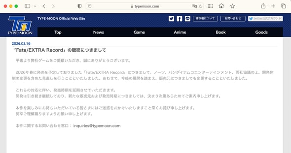 バンダイナムコエンターテインメントは3月16日、2026年春に発売を予定していたゲーム「Fate/EXTRA Record」について、同社からの販売を中止すると発表した。開発元のノーツ(ブランド名:TYPE-MOON)は「開発体制の変更を含めた見直しを行う」としている。発売時期は未定。