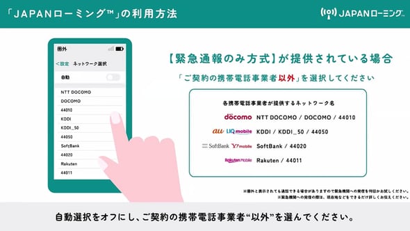 一方の緊急通報のみ方式の場合、利用者はネットワークを「手動選択」に設定し、救済事業者のネットワークを指定する必要がある。その際、1)ネットワーク名の横に(禁止)と表示されていても選択できる、2)「圏外」と表示されても繰り返し発信を試すことが推奨されるなどの注意点がある。