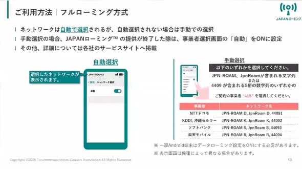 春以降に発売されるスマートフォンは、技術基準として対応が求められるため、基本的に全てJAPANローミング対応機種となるが、既存モデルについては発売元の対応による。