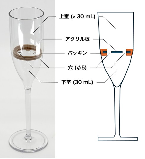 グラスの中央には2つの穴(空気穴と液体移動穴)が空いたアクリル製の仕切り板が設置されており、グラスを傾けて飲む動作に連動して、下室の液体が上室へと徐々に流れ込む。これにより、グラスから漂う香りを楽しみながら、飲み始めから飲み終わりにかけて味がシームレスに切り替わる体験を生み出している。