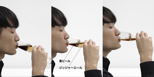 実験では、10秒間で飲み干すことを想定し、飲むにつれてジンジャーエールの割合が増えていく今回開発のコップ(うつろいドリンク)と、最初から均等に混ぜ合わせた通常のコップの比較が行われた。