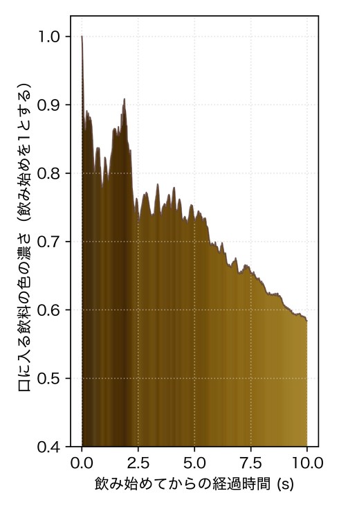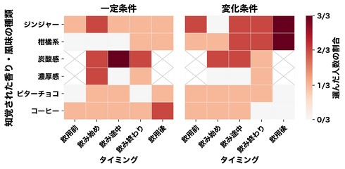 一方、飲み始めの濃厚感については、最初から2つの飲料が混ざり合っている通常のコップの方が味の複雑さによって高く評価されるという課題も見つかった。