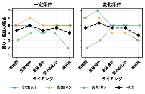 実験の結果、通常のコップでは飲用後に黒ビール特有の苦味が残りがちであったのに対し、うつろいドリンクを用いた場合では嚥下後の苦味が消失し、明確なキレがもたらされることを示唆。つまり、重厚な味わいなのに、一瞬で味が消えるという、単一の飲料では成し得ない体験の可能性を示した。