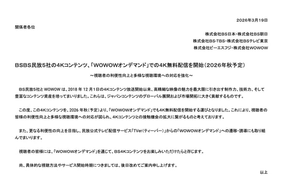 発表したのは、BS日本、BS朝日、BS-TBS、BSテレビ東京、ビーエスフジで、WOWOWも名前を連ねた。理由については「視聴者の利便性向上と多様な視聴環境への対応が図られ、4Kコンテンツとの接触機会の拡大につながる」と説明。具体的なサービス開始時期や視聴方法などは、後日改めて発表する。