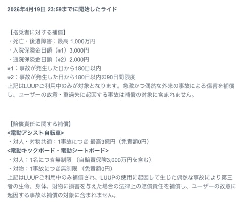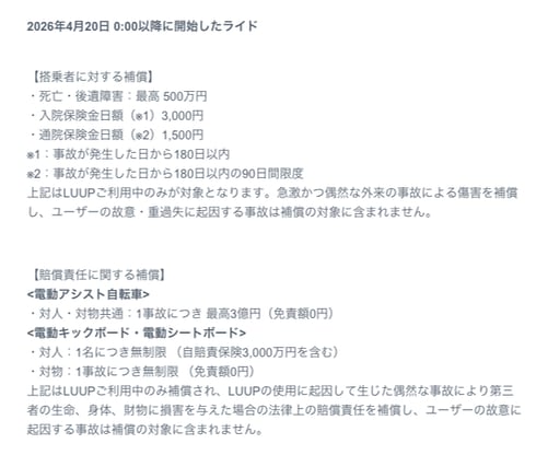 LUUPの場合、保険料は利用料金に含まれる。ただし搭乗者に対する補償は、利用中の「急激かつ偶然な外来の事故による傷害」が対象。ユーザーの故意・重過失に起因する事故は対象外となっている。