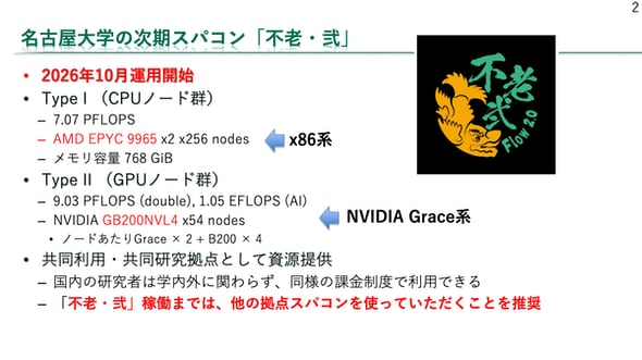 不老は2020年7月から同センターが運用している東海地区最大のスパコン。不老という名称は、名大本部がある不老町と計算処理のフローを掛けたもので、公募によって名付けられた。