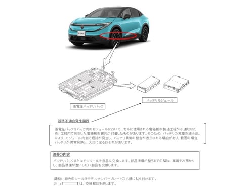 該当するのは2025年12月1日から26年3月7日に製造された車台番号「ZE2-100173」から「ZE2-105683」までの171台。バッテリーパックもしくはモジュールの交換となる。