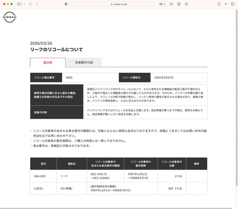 日産自動車は3月26日、EV「リーフ」(ZAA-ZE2)の一部をリコールすると国土交通省に届け出た。火災を伴う事故も報告されている。