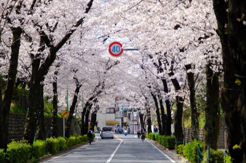 もう1枚、桜並木を。こちらは江戸時代に用水路として切り通したところを道路にした道なので、桜並木の谷って感じがすごくいい。こういうときも望遠で撮ると桜がより密集している感じになる。