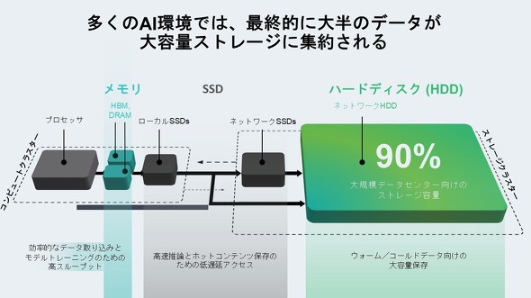 「SSDは高速処理に不可欠ですが、全てのデータを置くためのメディアではありません。AIをスケールさせる土台となっているのは、コスト、電力、拡張性の観点で合理的なHDDによる大容量ストレージです。AIに限らず、企業データの大半はバックアップ、オブジェクトストレージ、ファイルサービスといった容量の大きい汎用(はんよう)ワークロードなので、容量とコスト効率が重要な要件になります」