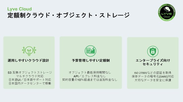 安河内氏は、データのライフサイクル全体を支えるソリューションとしてクラウドストレージ「Lyve Cloud」を紹介した。Amazon S3互換のオブジェクトストレージで、API利用料やデータ転送料(エグレス料金)がかからない定額制を採用しているため、予算を管理しやすい。