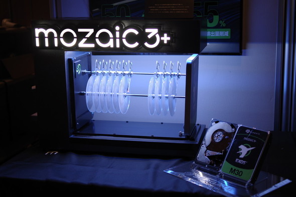 展示ブースの解説を担当する日本シーゲイトの岩田太郎氏(営業本部 営業技術部長)によると、Exos HDDはHAMRを搭載したMozaic 3+を採用。記録ヘッドに搭載されたナノ秒単位のレーザーダイオードがプラッタ(円盤)を局所的に加熱して書き込むことで、1プラッタ当たり3TBを超える記録密度を実現したという。今回は3.5インチで32TBという大容量製品を展示した。