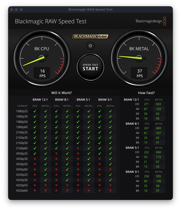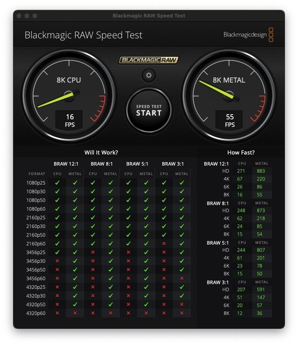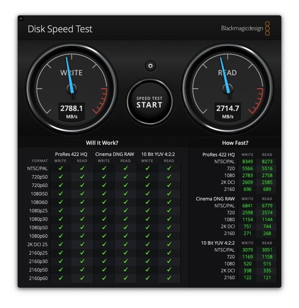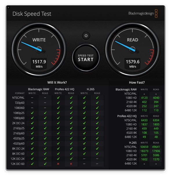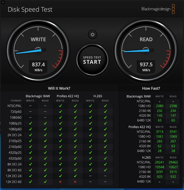 いつものように「Blackmagic Disk Speed Test」を使って、SSDの性能を測定してみた。速度的には「ProRes 422 HQ」で12K DCI 24pぐらいまではどうにかクリアできるが、60pになると厳しいようだ。一方「Blackmagic RAW」であれば、12K DCI 60pまで読み書きできるようである。