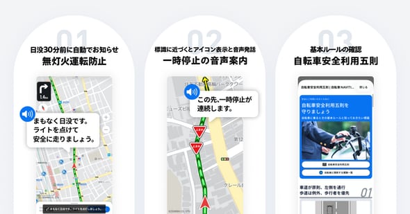 そこで自転車NAVITIMEでは、1)ナビゲーション中に日没前になると音声案内と画面表示でライト点灯を促す「無灯火運転防止」、2)ナビゲーション中にルート上の一時停止標識を地図上に表示して標識に近付くと音声発話する「一時停止案内」、3)初回のナビゲーション開始ボタンをタップ後に注意喚起を促す「自転車安全利用五則」、4)「交通ルールの表示」、5)「画面注視防止モード」を加えた。