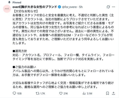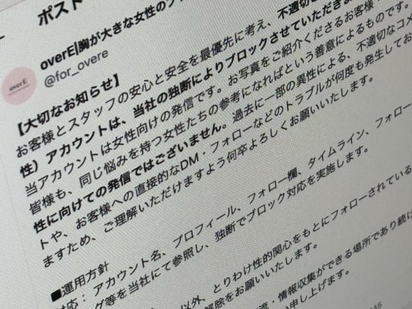 胸が大きな女性のためのアパレルブランド「overE」を展開するエスティーム(東京都新宿区)は4月1日、公式Xアカウントで、言動が不適切と判断した男性のアカウントは、同社の独断でブロックすると宣言した。トラブルが頻発しており、消費者とスタッフの安全のために公表したという。