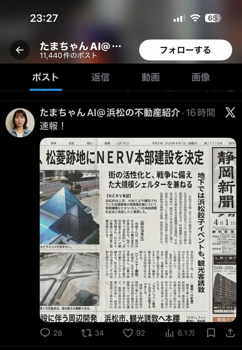 問題の投稿を行ったのは、浜松市内の賃貸物件を紹介する「たまちゃんAI@浜松の不動産紹介」というXアカウント。4月1日に静岡新聞の紙面を模した画像を添付し、新幹線「のぞみ」が浜松駅に停車することでJR東海と静岡県が合意したという、うその内容をポストした(削除済み)。「#エイプリルフール」のタグは付けていなかった。