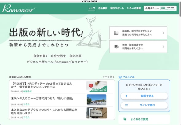 ボイジャーの「ロマンサー」は、「自分で書く 自分で残す 自立出版」をコンセプトにした総合電子出版支援サービスだ。Word形式のファイル(拡張子がdocxのファイル)をEPUB 3に変換し、専用アプリを使わず、Web上で電子書籍を読める「BinB」形式で公開できる他、専用のEPUBエディタ「NRエディター」を使えばWordなどを使わずにEPUB編集ができるなど、電子出版に関して、制作から公開、販売までサポートする。