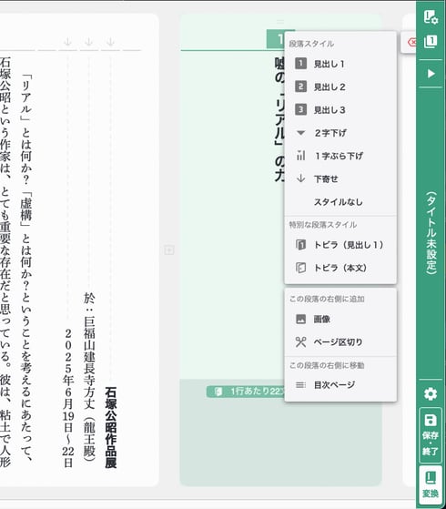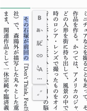 テキストを選択すると、このようなメニュー・パレットが表示され、ここで、文字スタイルや傍点、ルビ、リンクなどの設定ができる。個人的に気に入っているのが、ここで設定できる「記号で囲む」というコマンド。これ、文字列をワンタッチで囲んでくれる。この便利さ、縦書きフォーマットで本を作っている人なら分かってくれるはず「スタイルも、例えば文字のサイズも変えれるし、色も付けられるしっていう風にやると、『この文字強調したいから、太字にして、文字サイズもでっかくして、傍点も振って』とか色々やりたくなって、結果、いかにも素人っぽい感じの見た目のものになりがちっていうことは経験則で分かっていたんです。だから、最低限このスタイルさえあれば、それ以上のことはやらなくても『本っぽい見た目』にはなるんですよ、というのをまず分かってほしかったんです。選択肢を絞ってしまえば、選ぶときも迷わないし、見た目はきれいになるしということで、一石二鳥なんじゃないかと思って、スタイルをすごく減らしました」という木村さんの言葉は、案外“本作り”の重要なポイントを突いているように思った。多分、これが紙数枚のパンフレットやWebメディアではない『本』という形を作るための、電子にも紙にも共通するポイント。