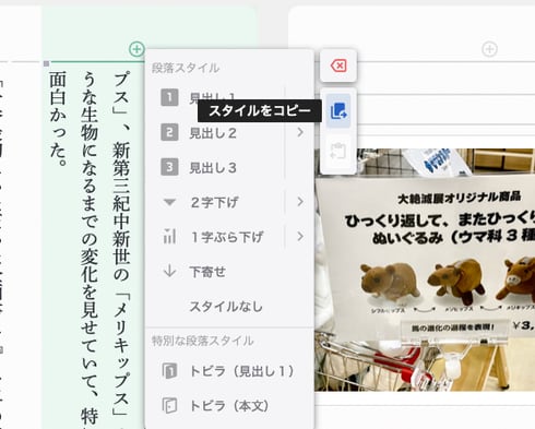 さらに、ある段落で設定したスタイルは、コピー&ペーストできる。これは、相当便利で、大昔、紙メディアがメインの時代にプロのライターがこぞって使っていた「Nisus Solo Writer」のルーラのコピペ機能を思い出したりした。さらに、字下げも、数値で設定するだけでなく、ドラッグして見た目で字下げ位置を設定できたりする。このあたりも、電子書籍で多用されるスタイルとはどういうものかを研究しているボイジャーならではのインタフェースだろう。