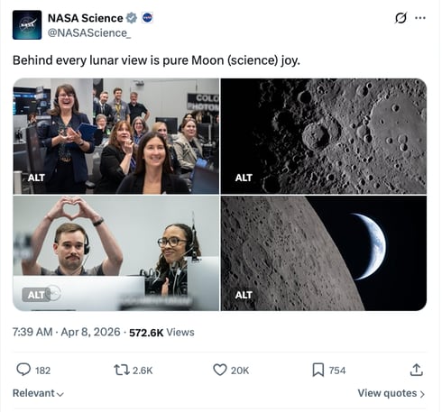 NASAの科学部門が運営する「NASA Science」アカウントは、月の表面や地球の写真に、地上スタッフたちの笑顔を並べた。添えた言葉は「全ての月の眺めの裏には、純粋な月(科学)の喜びがあります」だった。