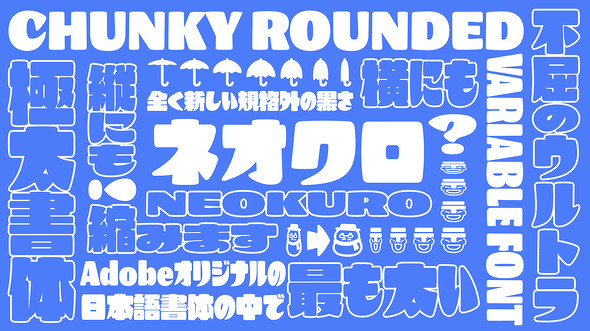 アドビは4月10日の「フォントの日」に合わせ、開発中の新書体「ネオクロ」を先行公開した。アドビオリジナルの日本語書体として最も太い極太書体で、仮名の字幅だけが縦横に変化するバリアブルフォント(1つのファイルで太さや幅を連続的に調整できるフォント形式)として設計されている。