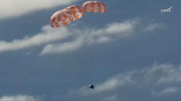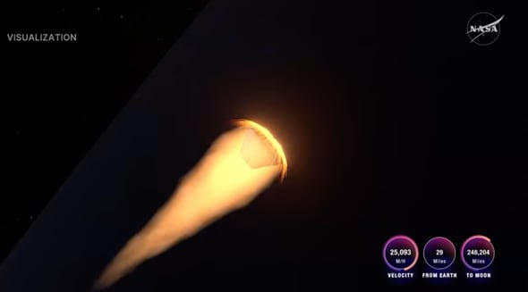 午後7時33分、オリオン宇宙船は4人の宇宙飛行士を乗せた「乗員モジュール」を分離し、その20分後に地上約121kmの上空で地球の大気圏に突入した。この時の速度は音速の約35倍だった。