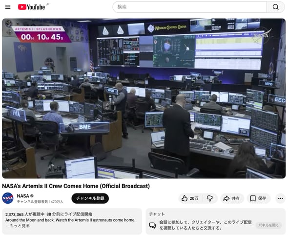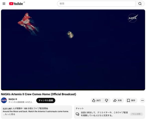 アメリカ東部時間の10日午後8時07分(日本は11日午前9時過ぎ)、NASAの有人月探査プロジェクト「アルテミスII」の宇宙船「オリオン」が、月周回ミッションを終えて地球に帰還した。その模様は、NetflixやHBO Maxなど多くのプラットフォームでライブ配信され、NASA公式のYouTubeライブ「NASA’s Artemis II Crew Comes Home」は、一時320万人以上の同時接続を記録した。
