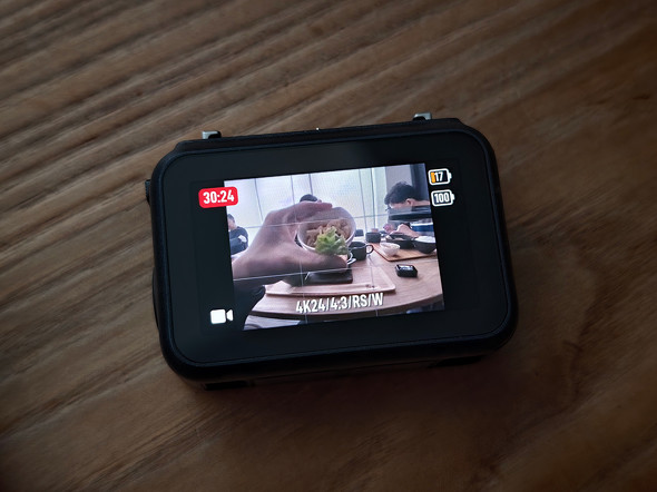 実際に胸にカメラをつけたまま食事を撮影してみたのだが、ドックをテーブルに置いておくと料理の画角を手元で確認しながら撮影できて具合が良い。ただしパンフォーカス設計のため最短撮影距離は35cmあり、「これ食べます」と料理をカメラに近づけてクローズアップという撮り方はできない。これはGO Ultraも同様(最短撮影距離は30cm)だ。