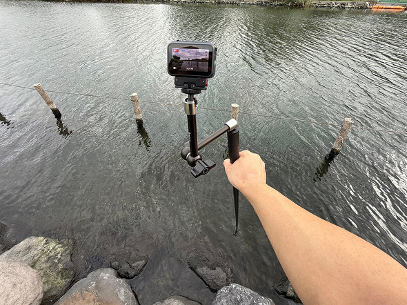 普段とは違うアングルを追うのも良い。棒の先端にカメラを取り付けて高い/低いアングルを狙うのも面白い。カメラ単体では水深10mまでの防水性能があるため、ドックを外せばそのまま水中に沈めることもできる。なお、試しに川にカメラを沈めてみたのだが、当然ながら水中では電波が届かないためドックの画面は真っ暗になった。