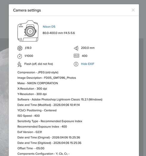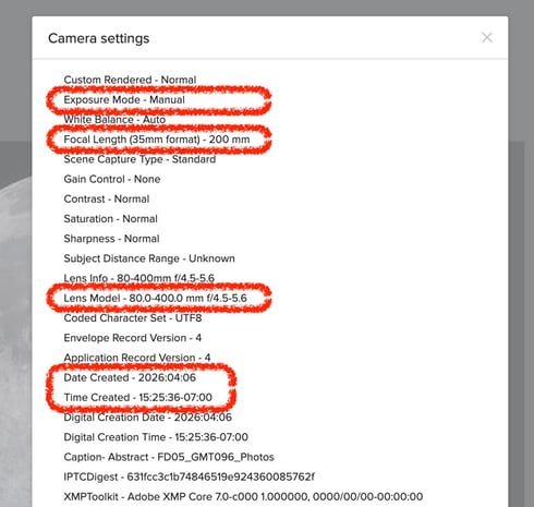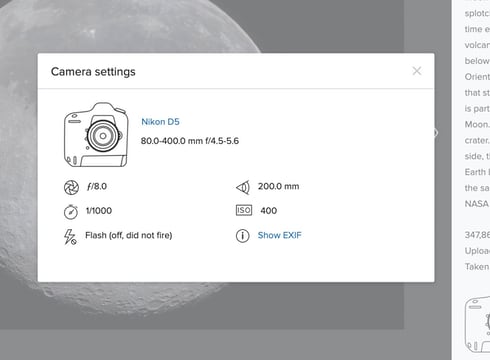 では、この月の写真は何mmで撮られたのか。「show settings」をクリックすると詳細なEXIF情報を見ることができる。