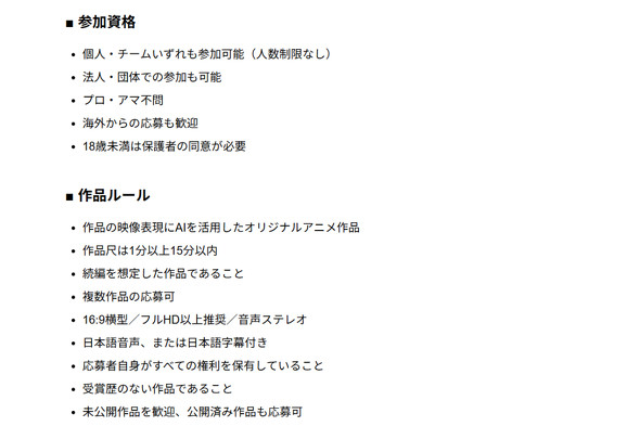 応募対象は作品の映像表現にAIを活用した1分以上、15分以内のオリジナルアニメ作品。続編を想定していること、16:9のフルHD以上、日本語音声または日本語字幕付きであることなどが条件となっている。プロ・アマチュア、個人・団体を問わず、海外からの応募も受け付ける。