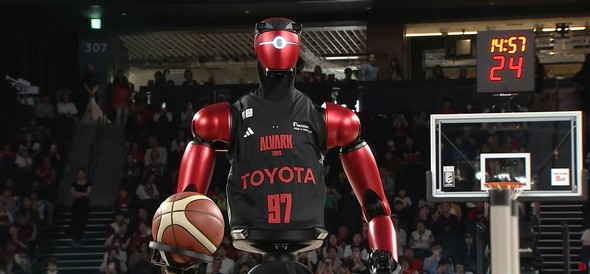 トヨタ自動車(トヨタ未来創生センター)は4月12日、AIバスケットボールロボットの新モデル「CUE7」を島根スサノオマジック戦のハーフタイムショーで初公開した。同ロボットは2ポイントシュートを一発で成功させたほか、ドリブルや観客を煽るようなジェスチャーも披露。投球動作に特化していた先代にはない、人間らしい動的な振る舞いを見せた。