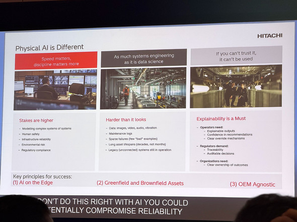 精度だけが課題ではない。Barirani氏は物理AIならではの困難として複数の点を挙げた。まず、インフラの長い寿命だ。変圧器も鉄道車両も数十年単位で稼働し続ける。AIシステムはそのライフサイクルを通じて更新が必要だが、古いインフラにはデジタル接続機能がない場合も多い。次に規制対応。鉄道・エネルギーなどの規制環境では「誰がいつ何を決定したか」の監査可能性と、AIを手動でオーバーライドできる仕組みが必須だという。人の安全や社会インフラの安定に直結するがゆえに、生成AIとは異なる厳格さが求められると強調した。