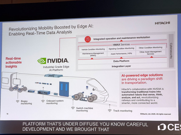 モビリティ領域では、列車へのNVIDIA製産業用エッジコンピューティング基盤「IGX」の搭載が進んでいる。車両内でセンサーデータをリアルタイム処理し、故障の兆候をその場で検知する仕組みだ。これまでは車両データを本社に送り、分析に最大10日かかるケースもあったが、Barirani氏は「列車の上にデータセンターを作るようなものだ」と表現する。この仕組みにより予防保全のサイクルが大幅に短縮されるという。欧州での導入事例では、エネルギー消費量15%減・列車遅延20%減・保守コスト15%減の成果が出ているとしている。
