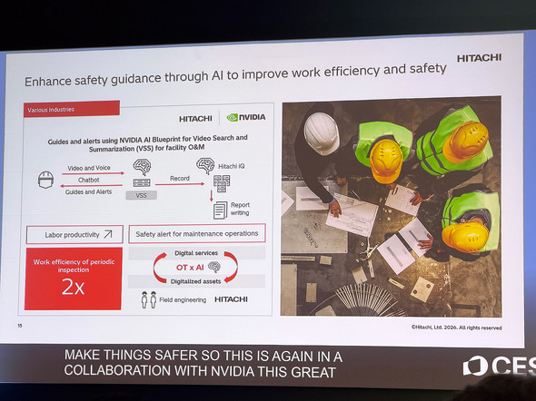 産業安全の分野では、NVIDIAのVSS(Video Search and Summarization、映像検索・要約技術)を活用したソリューションを展開している。工場の作業員がカメラとヘッドセットを装着して作業し、AIが映像をリアルタイム解析。危険な動作や手順の誤りを検出すると、音声ガイダンスでその場でフィードバックを返す。「AIは仕事を危険にするものではなく、安全にするためのものだ」とBarirani氏は語った。