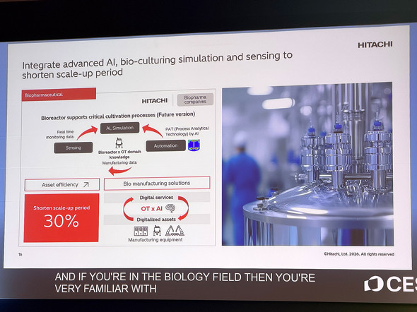 日立はセンサーデータをAIに入力し、シミュレーション上で大量のパラメータ組み合わせを高速評価。最適解が見つかったら、エージェンティックAIが実機のパラメータをリアルタイムで自律変更する仕組みを構築した。Barirani氏によると、スケールアップにかかる期間を30%短縮できたという。1年、2年、あるいは数年かかるスケールアップが30%縮む意味は大きいと語った。