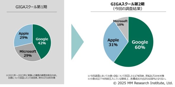 25年夏頃のMM総研の調査によれば、GIGAスクール第1期では若干Chromebookが多いものの、3種が均衡状態にあった。だが第2期の調達状況を見ると、Windowsが大幅にシェアを下げ、その分がほぼChromebookに流れる結果となった。