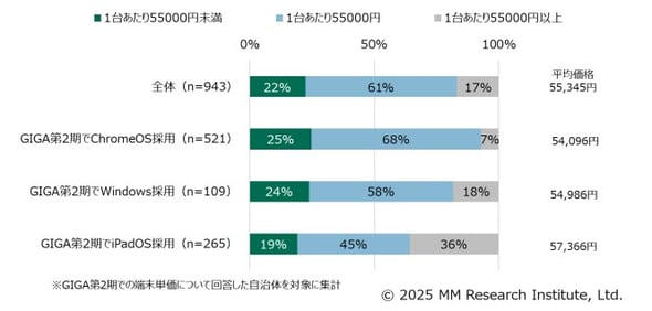 MM総研の調査では、ChromeOSは平均5.4万円、Windowsが5.5万円、iPadOSが5.7万円となった。調達費用は基本的には自治体負担だが、政府補助が5.5万円出る。ただし公立・私立学校、日本人学校などに対しては、補助率は3分の2に留まる。
