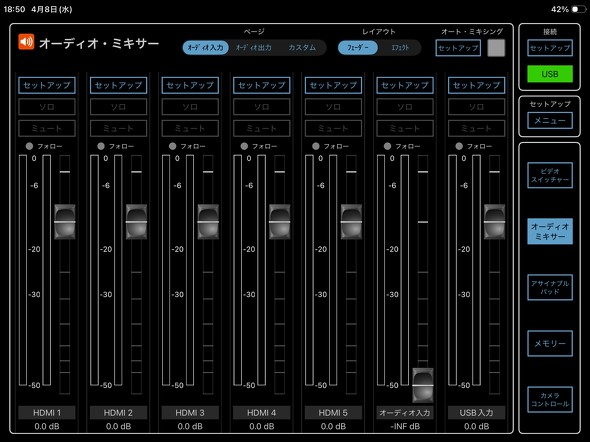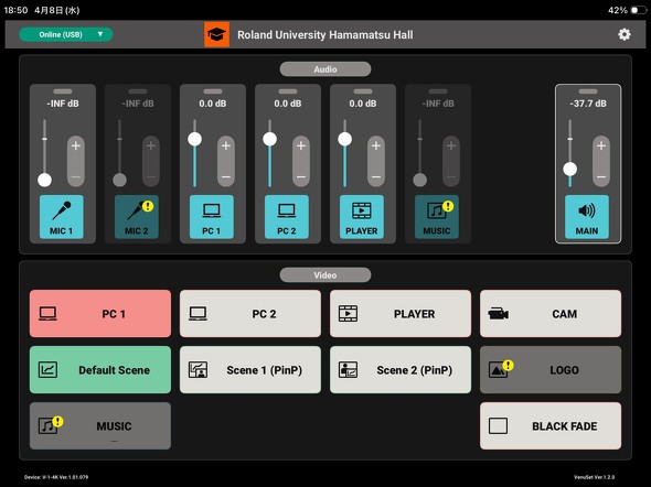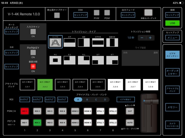また、iPad対応「V-1-4K Remote」もリリースされる。設定などをグラフィカルに操作できるのに加え、コントロールパネル上の操作も可能だ。本体とV-1-4K Remote、もしくはVenuSetを併用すれば、2人でのスイッチング操作が可能になる。USB経由ではiPadは1台しかつながらないが、LAN経由でもう1台つなぐことができる。