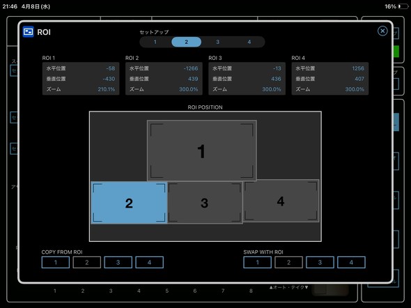 例えば入力1に4Kカメラを接続すると、クロスポイント1〜4までがROIの1〜4に割り付けされる。ROIの設定はコピーしたり、設定を入れ替えることもできる。