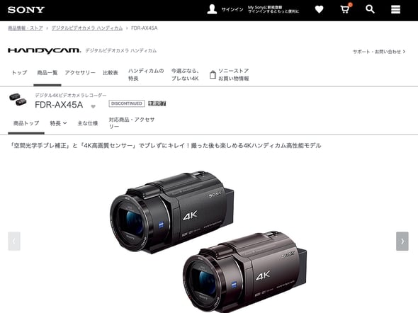 ソニーの民生用ビデオカメラ「ハンディカム」シリーズの生産が終了したのではないか──と、SNS上で話題になっている。ソニーストアで唯一販売されていた4Kビデオカメラ「FDR-AX45A」(2022年発売)の商品ページに「生産完了」と表記されたためだ。