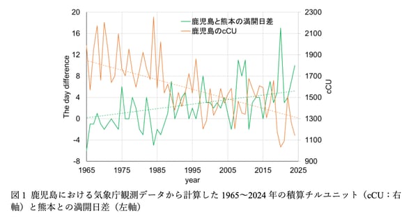 研究チームは、1965年から2024年にかけて鹿児島地方気象台で観察された満開日の記録と、休眠打破のための低温刺激の指標となる「積算チルユニット値」(cCU)との関係を分析した。すると鹿児島のcCUが低いと熊本より満開日が遅くなり、低温刺激不足によって開花が遅れていたことが確認された。