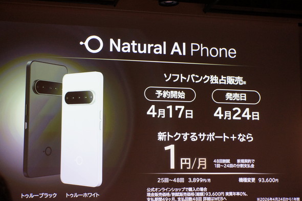 ソフトバンクは4月17日、米国のAIスタートアップ・Brain Technologiesが手掛けるAI機能搭載スマートフォン「Natural AI Phone」を国内で販売すると発表した。同日に予約受付を始め、24日から国内で1年間独占販売する。端末価格は9万3600円。