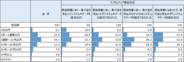 従業員規模で見ると、300人以上の企業と5000人以上の大企業で被害を受けた割合はほとんど変わらず、規模によらず攻撃の対象になっていることが分かった。システム復旧までに要した時間は、身代金の支払い有無によらず「1週間〜1カ月以内」(34.7%)が最も多かった。