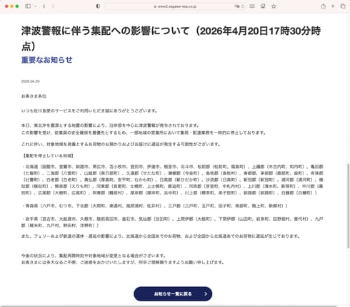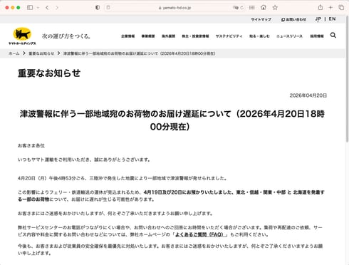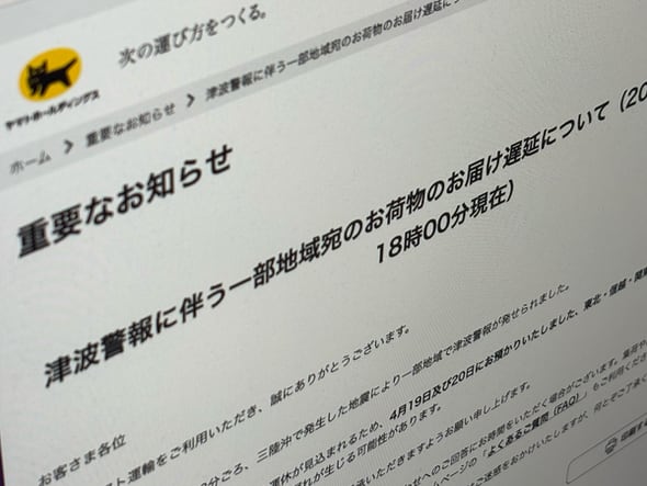 4月20日の午後4時53分ごろに三陸沖で発生した震度5強の地震と津波警報により、宅配便に配送遅延が生じる可能性が高まっている。ヤマト運輸と佐川急便が自社Webサイトなどで状況を説明し、利用者に理解を求めた。
