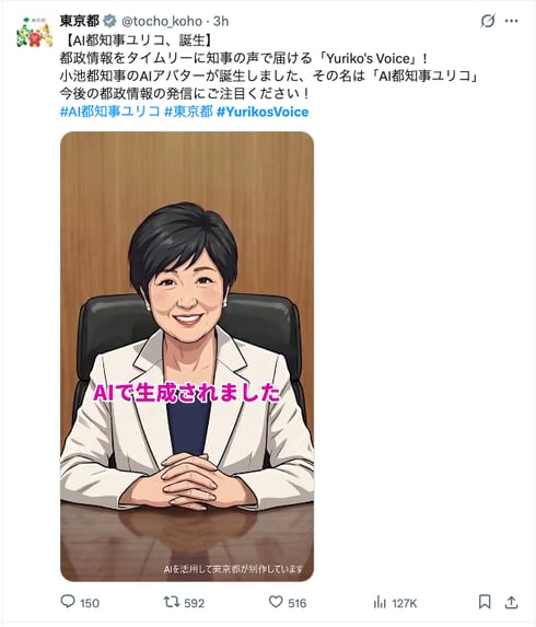 東京都は4月21日、小池百合子都知事のAIアバター「AI都知事ユリコ」を公開した。「都民の皆様に分かりやすく情報をお伝えする」のが目的。東京都のWebサイトや公式Xアカウントで動画を公開している。