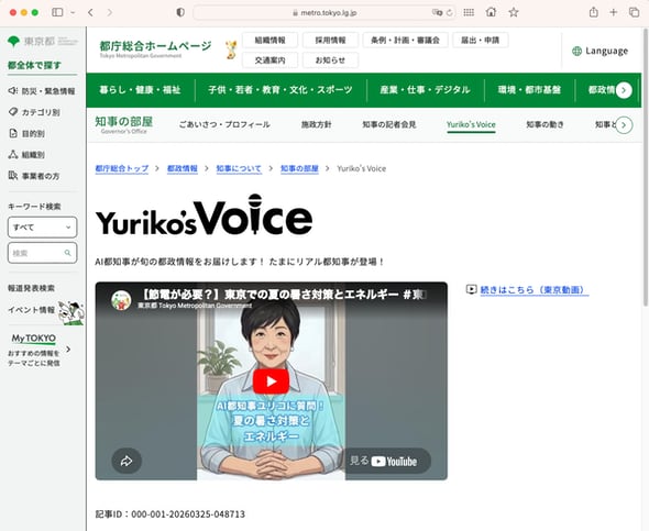 東京都のWebサイトでは「知事の部屋」の中に新コーナー「Yuriko's Voice」を設け、ここにAI都知事ユリコの動画を掲載していく。なお「たまにリアル都知事が登場」するという。