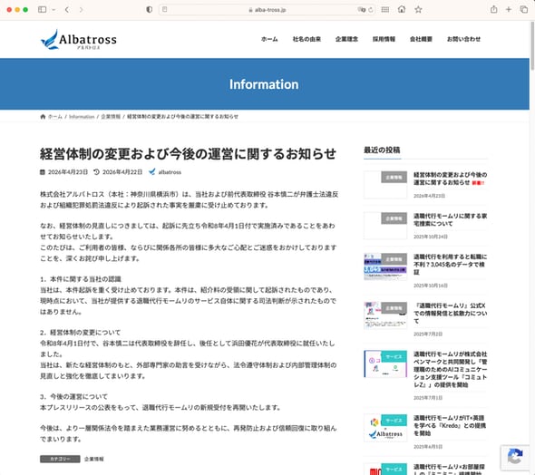 退職代行サービス「モームリ」を運営するアルバトロス(神奈川県横浜市)は4月23日、経営体制の見直しを行ったことを公表し、モームリの新規受付を再開すると発表した。「今後は、より一層関係法令を踏まえた業務運営に努めるとともに、再発防止および信頼回復に取り組んでいく」としている。